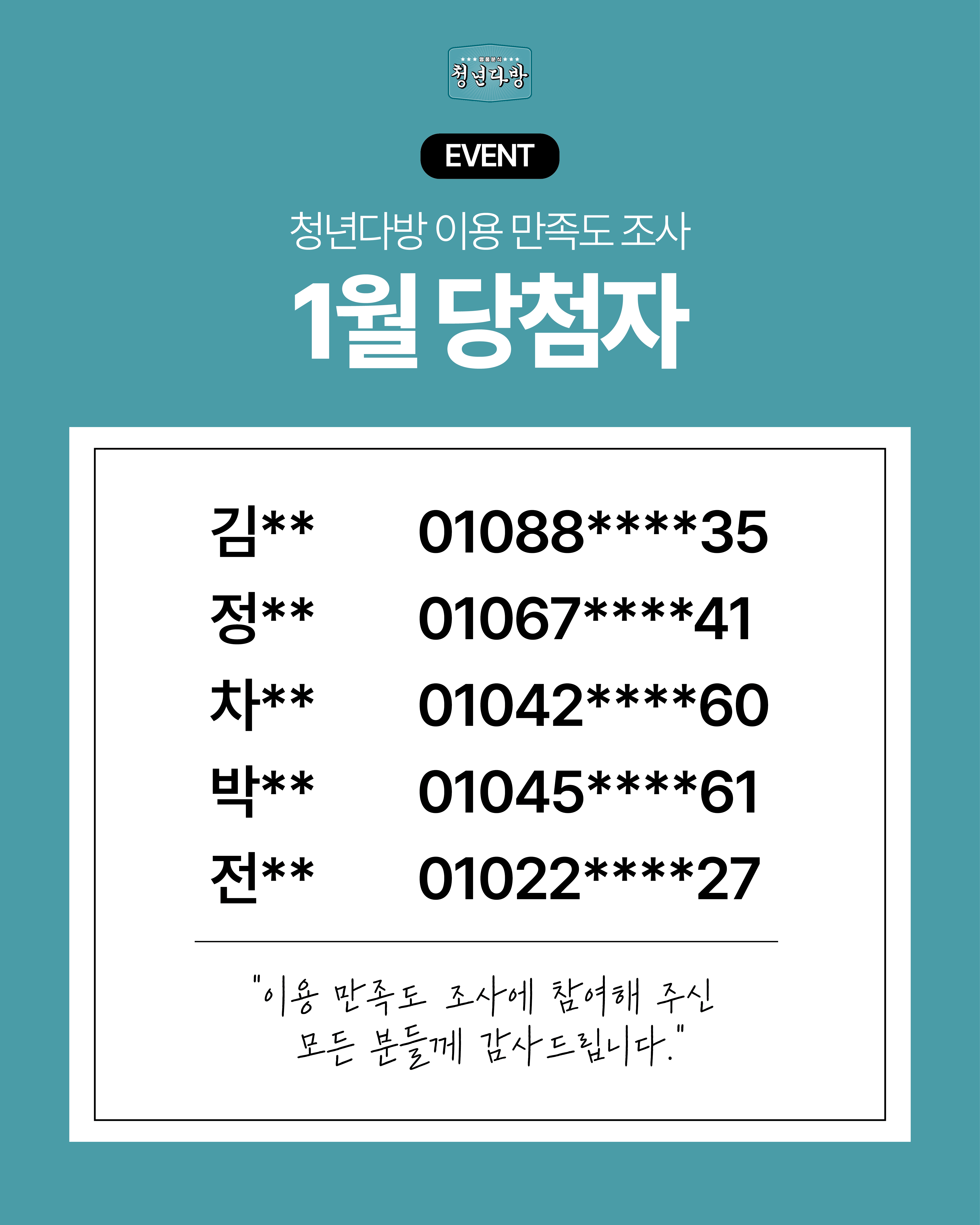 청년다방 만족도 조사 이벤트 1월 당첨자 발표